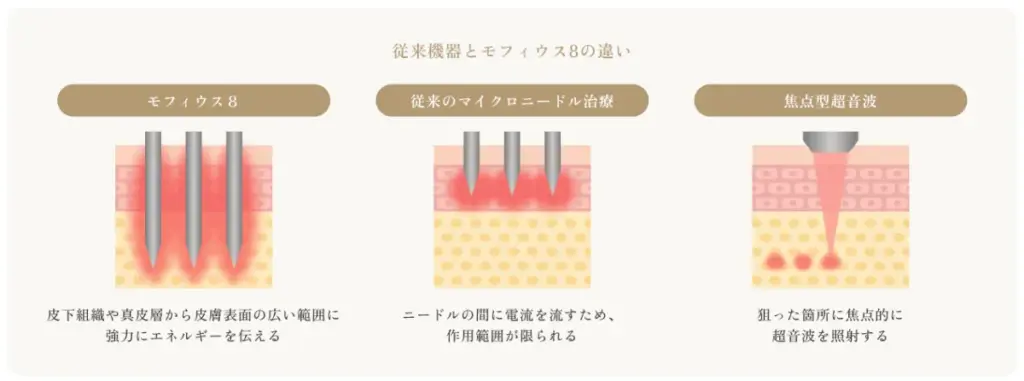 一方モフィウス8は、皮下組織や真皮層から皮膚表面にかけて広い範囲に対し、安全かつ強力にエネルギーを伝えることが可能です。その結果、顔全体を面でとらえるようなタイトニング効果が得られ、より立体的でメリハリのある仕上がりが期待できます。