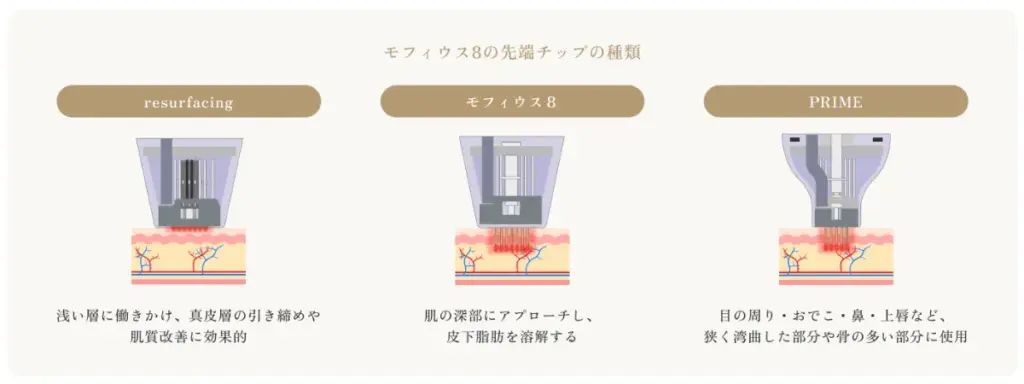 現在は3種類のチップが用意されており、患者さまの状態やお悩みに応じて柔軟な対応が可能です。たとえば、これまで切開が必要とされていた目の下のクマ(眼窩脂肪のたるみ)に対しても、モフィウス8ならメスを使わず改善を目指すことができます。