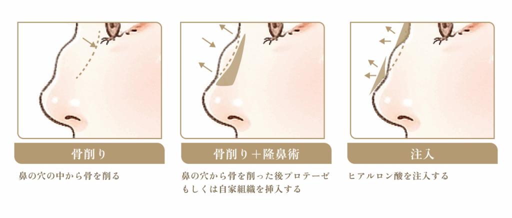鷲鼻修正は鼻のハンプ(突き出た部分)を削って、細くまっすぐな美しいラインにします。削った部分は低くなりますが、全体のバランスを見ながら手術しますので、鼻は低くなりません。