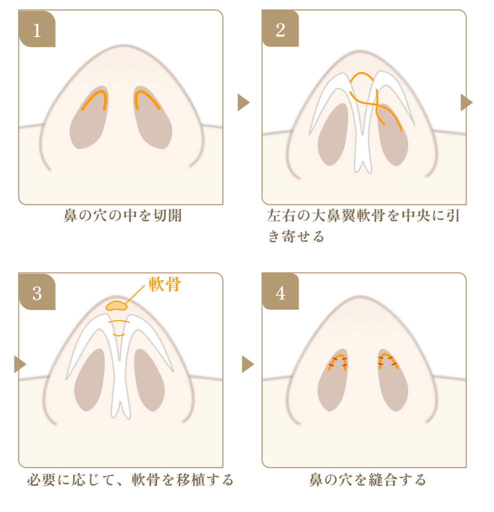 左右の鼻腔内から鼻柱に向けて皮膚を切開し、オープン法で大鼻翼軟骨の広がりを調整し、左右の軟骨を中央に引き寄せます。その後、切開部を縫合し固定して手術を終了します。
